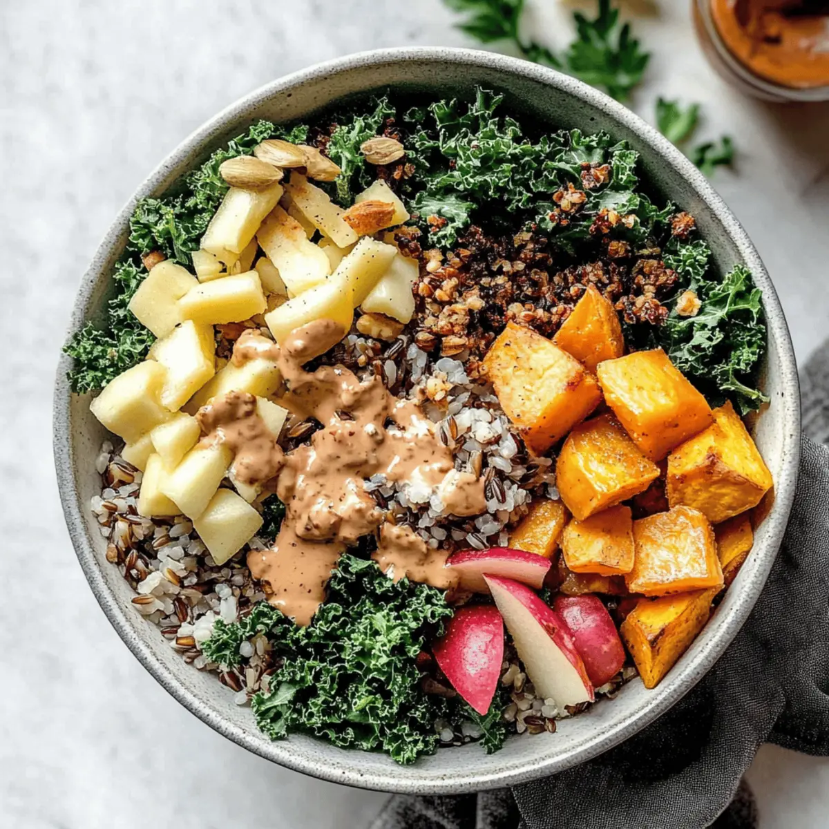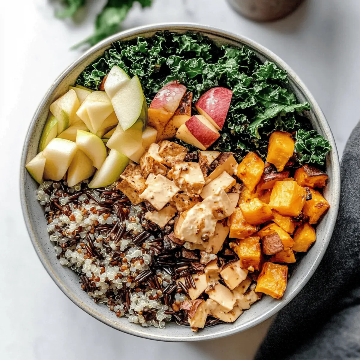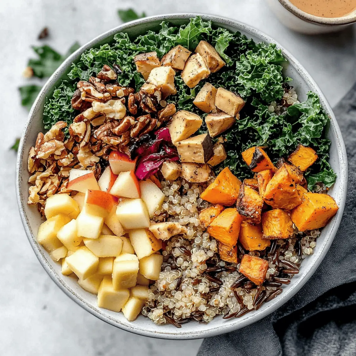 Once everything is ready, start assembling your Cozy Autumn Grain Bowls. Layer the massaged kale as the base, then add generous scoops of wild rice and quinoa. Top with the roasted sweet potatoes, diced apples for a crisp contrast, and smoked gouda for creaminess. Sprinkle walnuts on top for added crunch and richness.