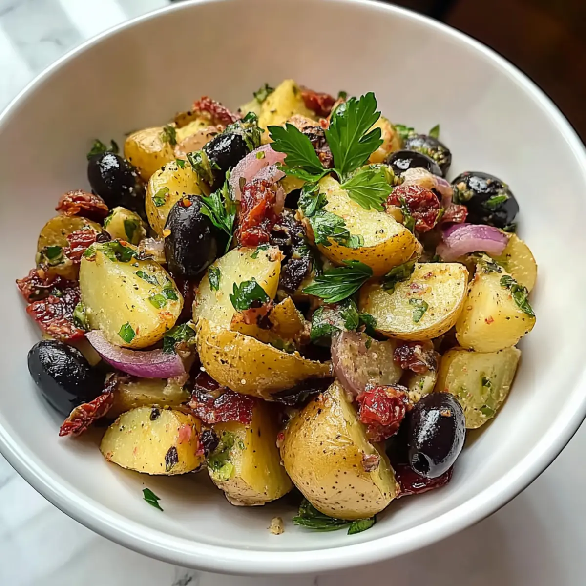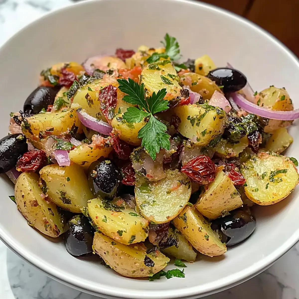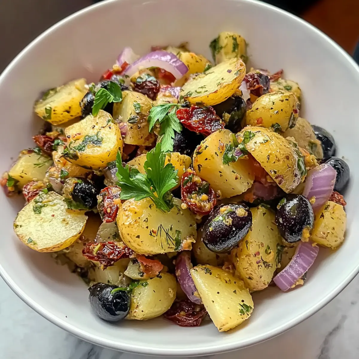 - In the same bowl, combine the cubed potatoes with red onion, parsley, olives, pickles, capers, and sun-dried tomatoes.
