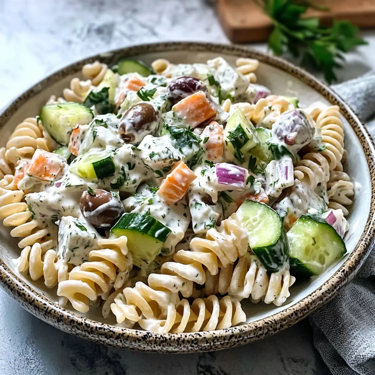 While the pasta cools, chop your vegetables. Dice the cucumber, carrot, sweet onion, and bell pepper into small, uniform pieces for even flavor distribution. Chop the kalamata olives and fresh parsley as well. In a large mixing bowl, combine all the diced vegetables, ensuring a vibrant blend ready to complement your Tzatziki Pasta Salad.