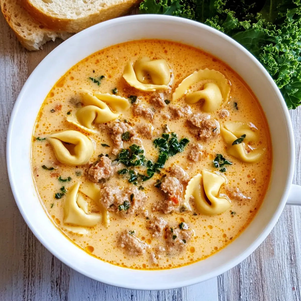 As I stirred the pot, the rich aroma of sautéing garlic and Italian sausage filled my kitchen, instantly warming my heart. This Creamy Tortellini Soup is my go-to comfort food, perfectly blending tender tortellini, vibrant kale, and a velvety broth that wraps around you like a cozy blanket. In just 30 minutes, you can whip up a meal that’s not only quick but also adaptable to any dietary needs—whether you’re feeding a family or hosting friends for a cozy gathering. Best of all, it’s a hearty dish that satisfies both the stomach and the soul. Who wouldn’t want a bowl of this warming goodness on a chilly evening? Let’s dive into the delicious details and elevate your weeknight dinners!