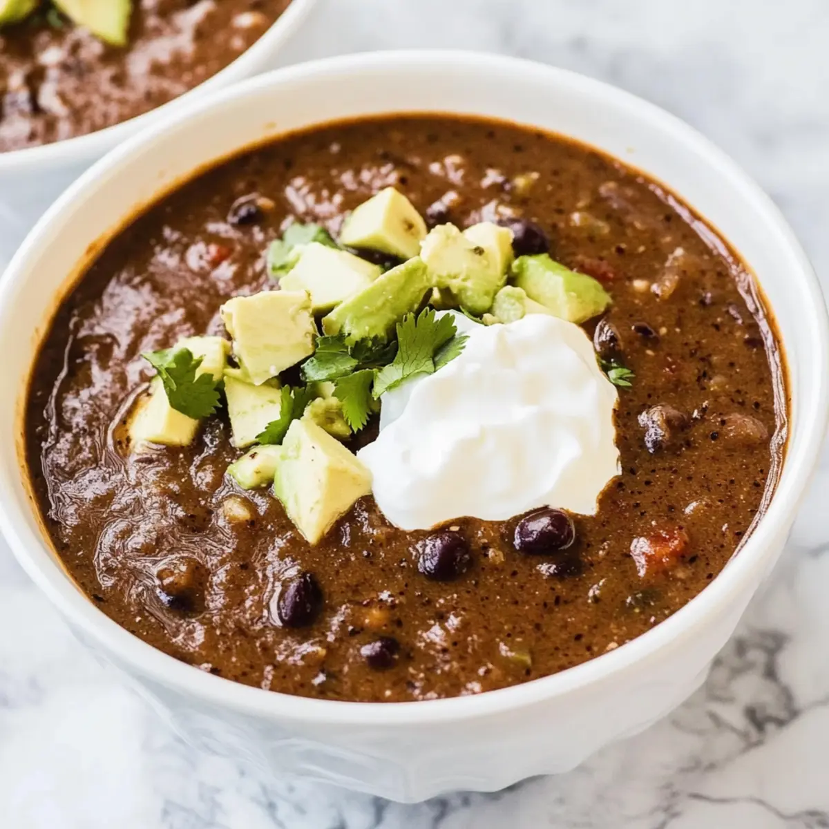 - Ladle the soup into bowls and top with sour cream, cilantro, and avocado before serving.