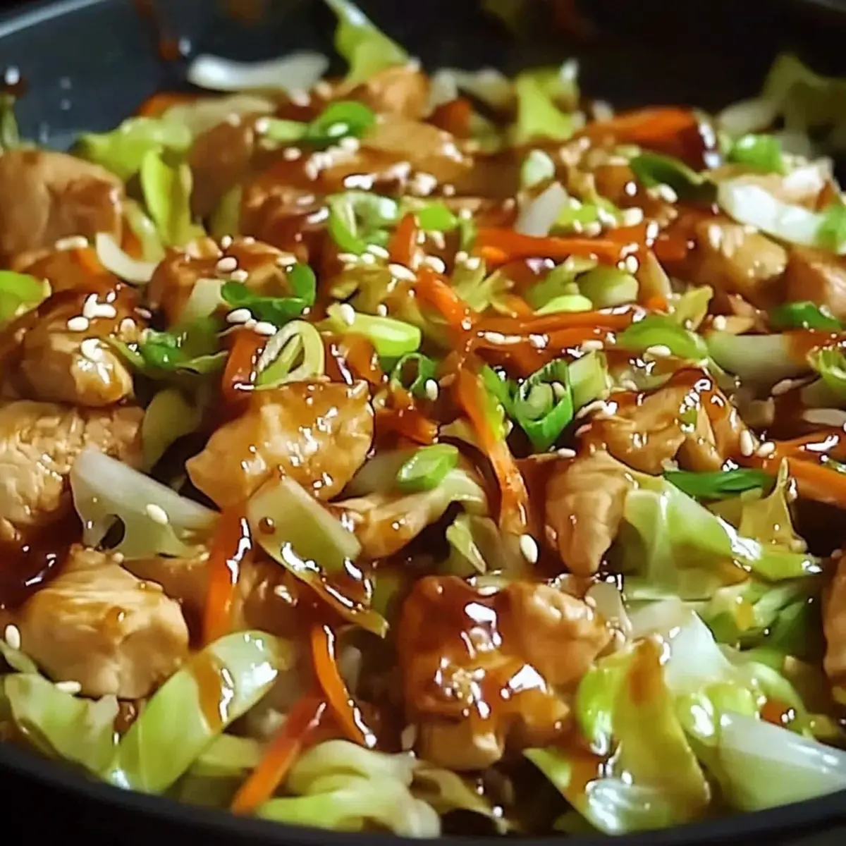 Once the sauce has reached your desired thickness, garnish your stir-fry with sliced green onions and, if desired, a sprinkle of sesame seeds. Serve the hot Chinese Chicken Cabbage Stir-Fry over fluffy jasmine rice or noodles for a complete meal that’s sure to please everyone at the table.