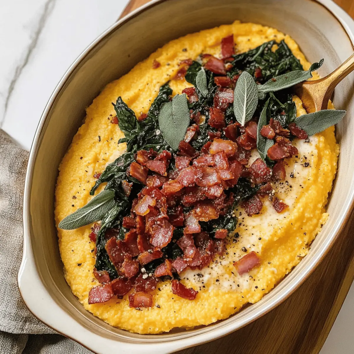 If the polenta has cooled, gently reheat it over low heat, stirring in a bit of additional stock or cream to adjust the creaminess. Pour the warm Creamy Pumpkin Polenta into a serving bowl, top generously with the sautéed Swiss chard, and sprinkle the crispy pancetta on top. Serve immediately while everything is hot and enticing, ready to be enjoyed.
