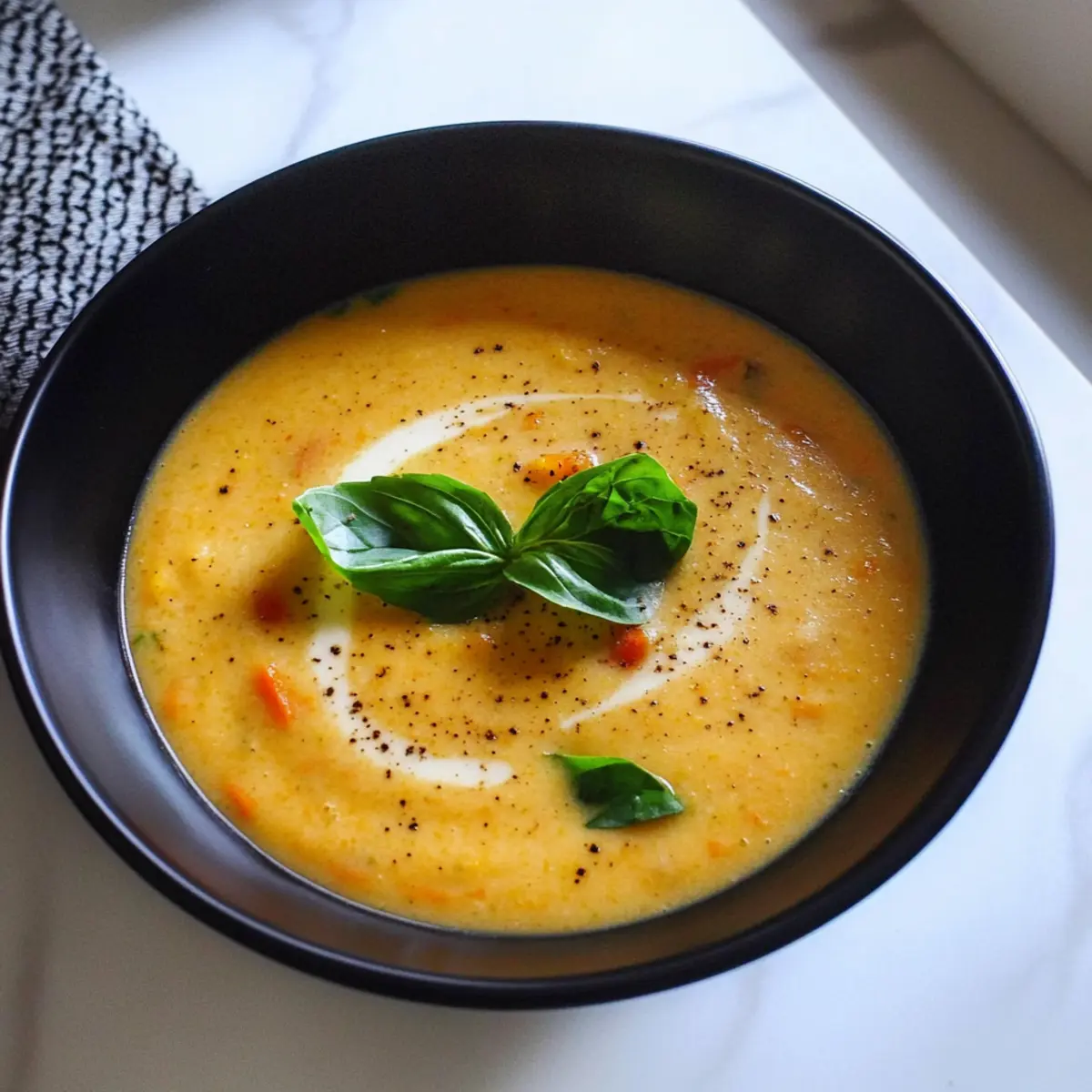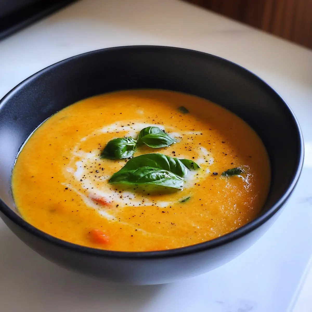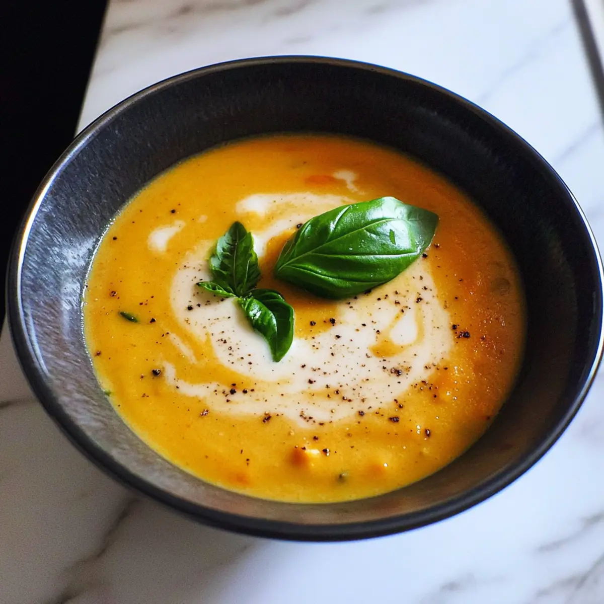 - Ladle soup into bowls and garnish with black pepper and basil leaves if desired.