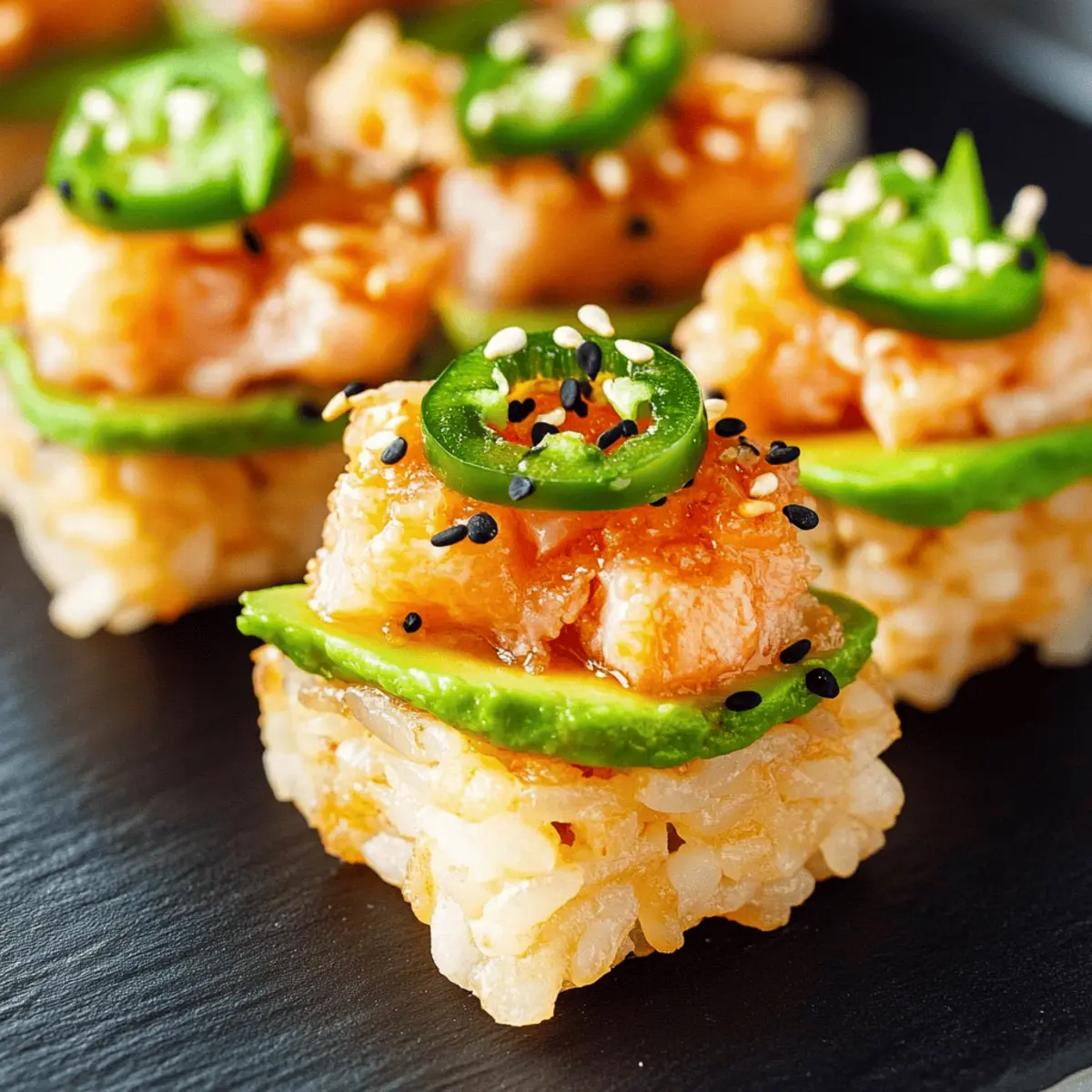 - Assemble by layering crispy rice, avocado, and spicy tuna mix, and garnish with sesame seeds.