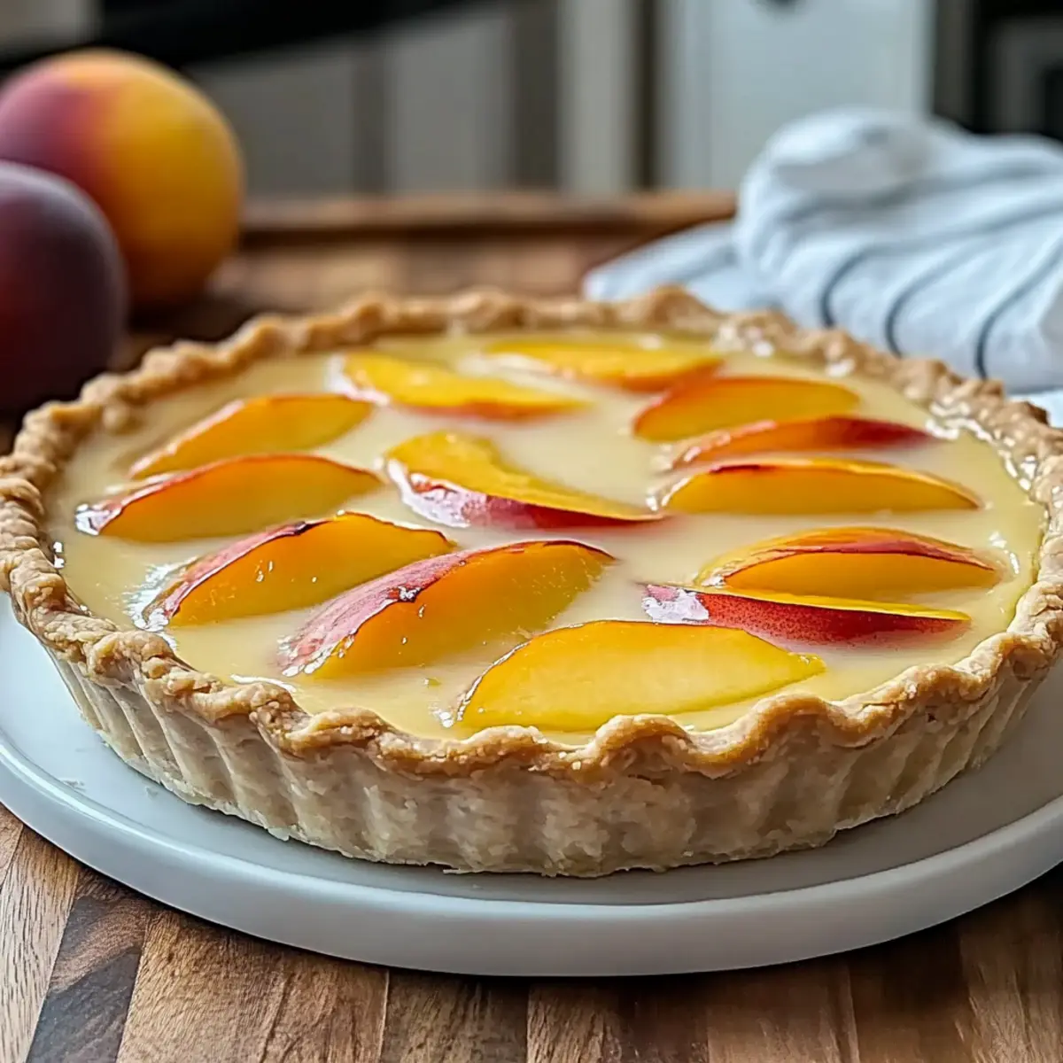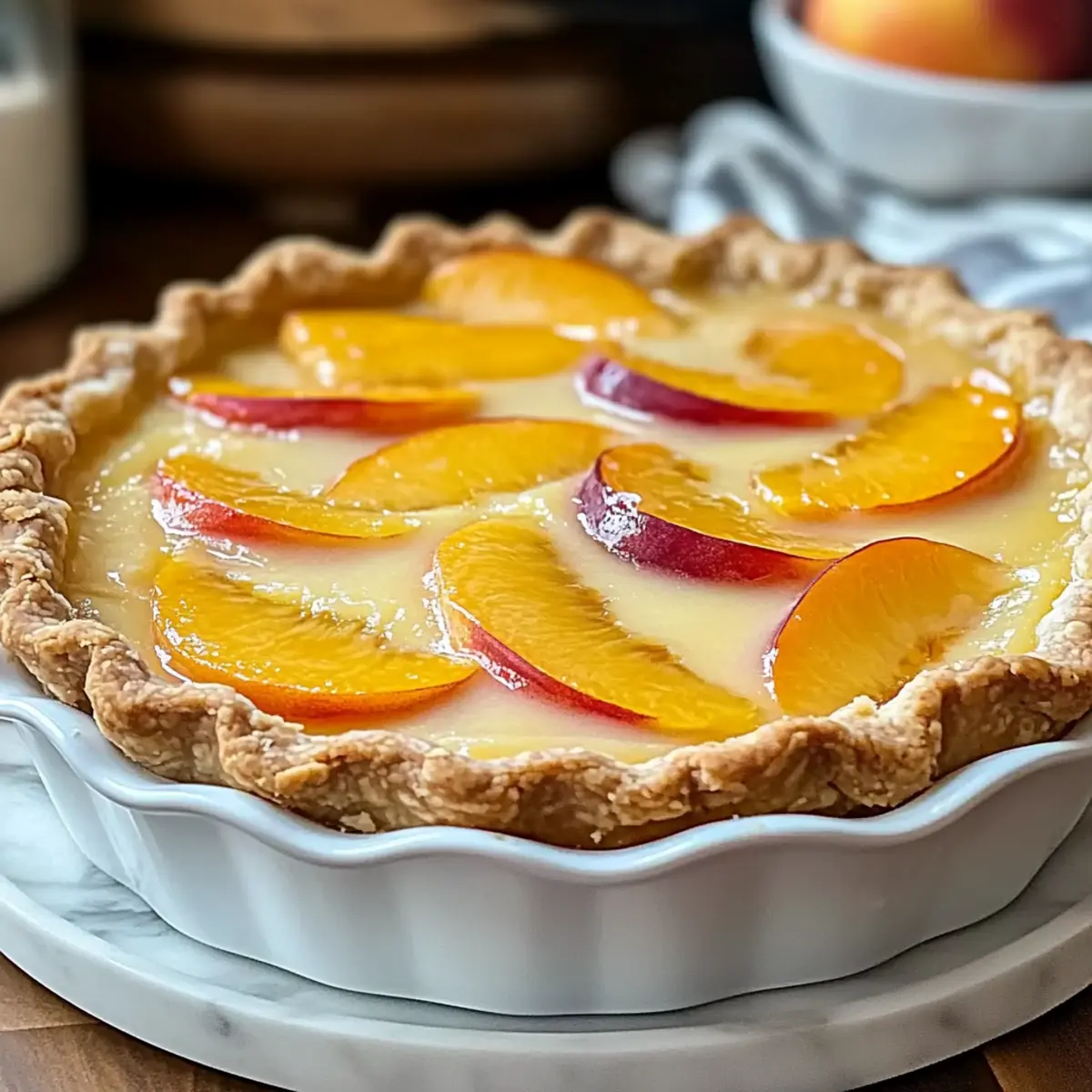 - Arrange the peach slices in the prepared crust and pour the custard mixture over them, ensuring they are submerged.