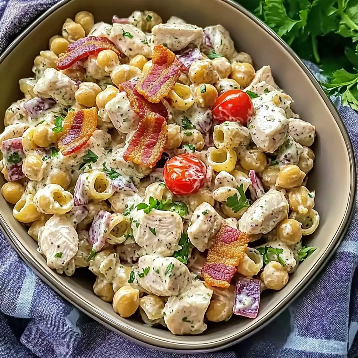 Once the chicken and bacon have cooled slightly, chop them into bite-sized pieces. In a large mixing bowl, combine the cooked chickpea pasta, roasted chicken, bacon, thinly sliced red onion, halved cherry tomatoes, and scallions. This is the heart of your pasta salad, where all the ingredients come together.