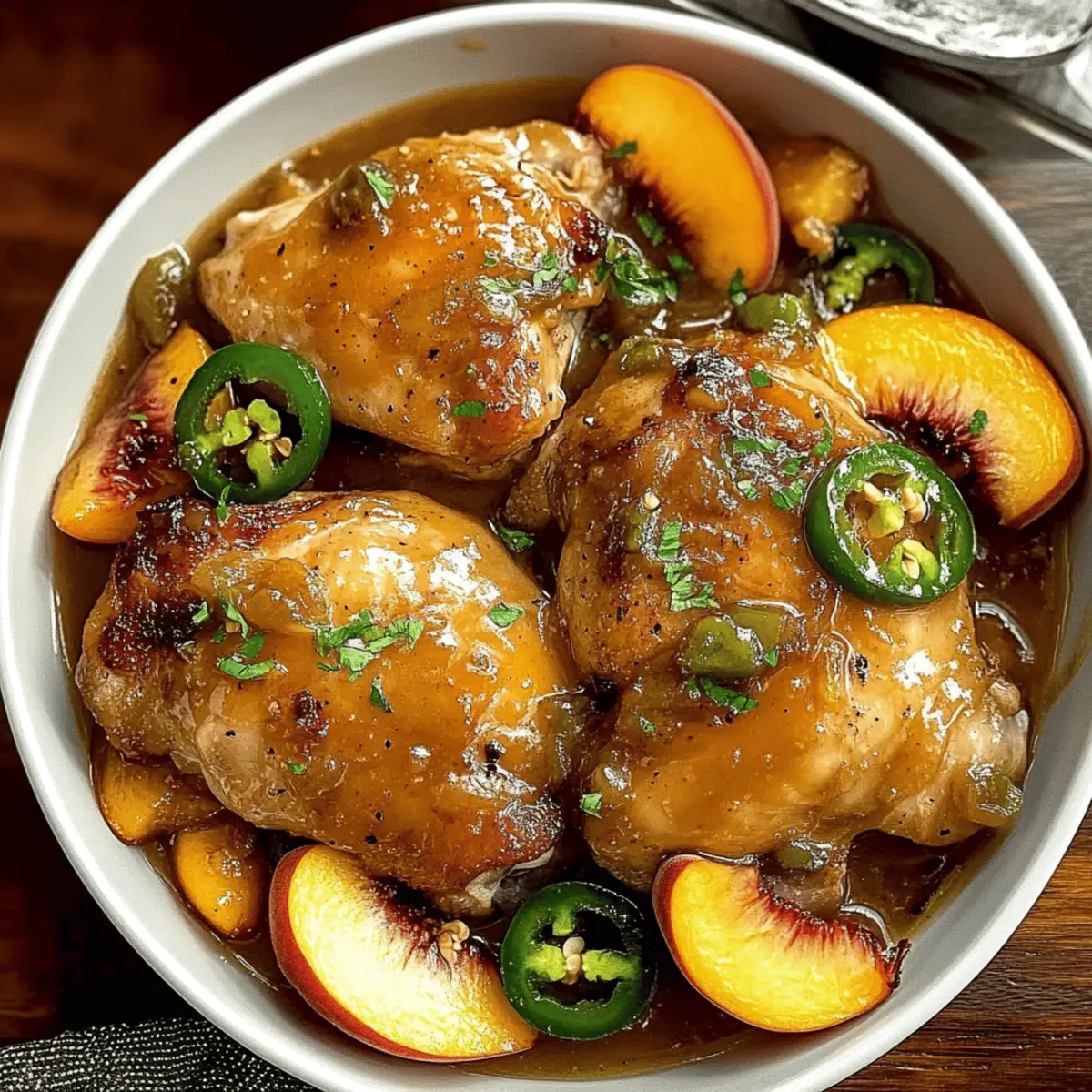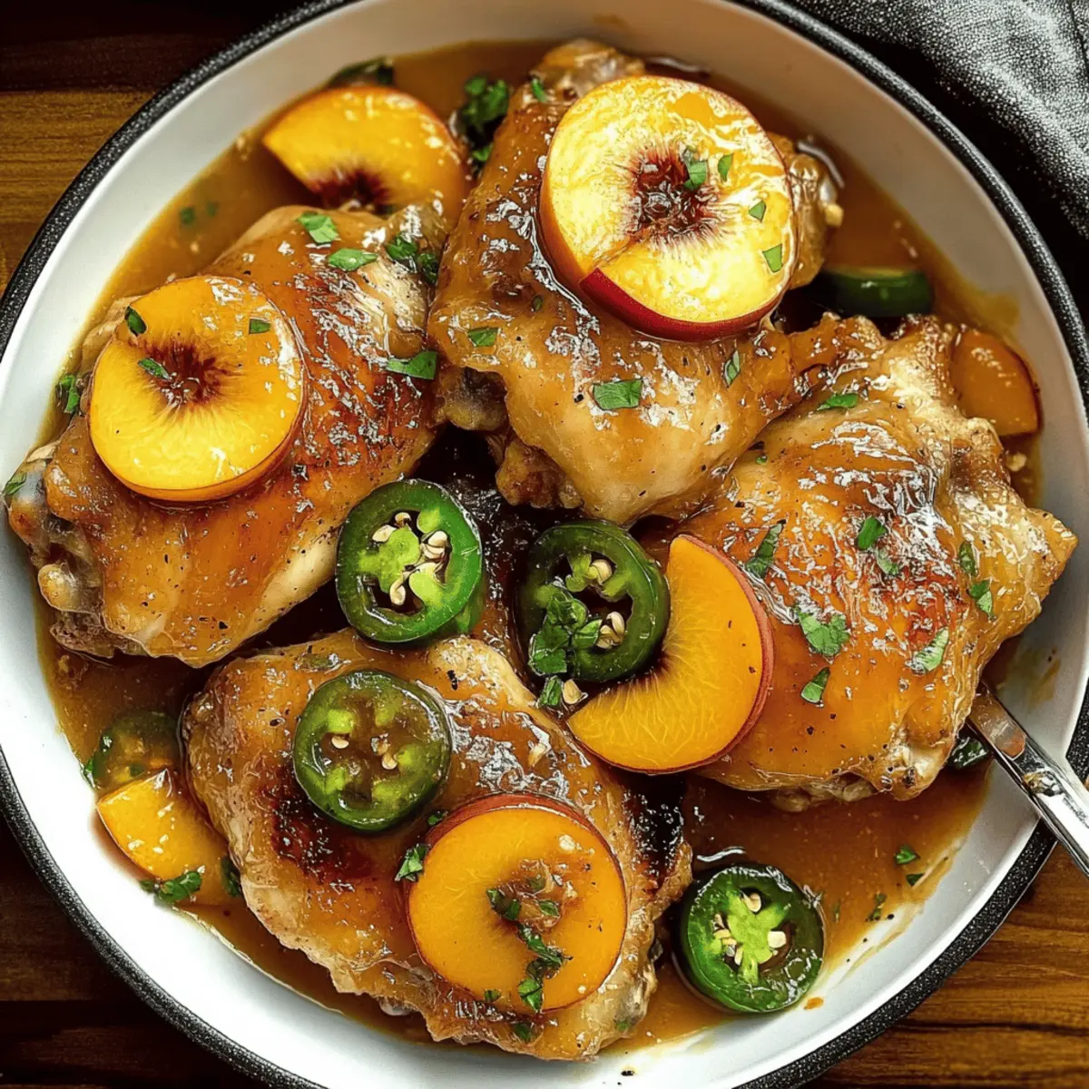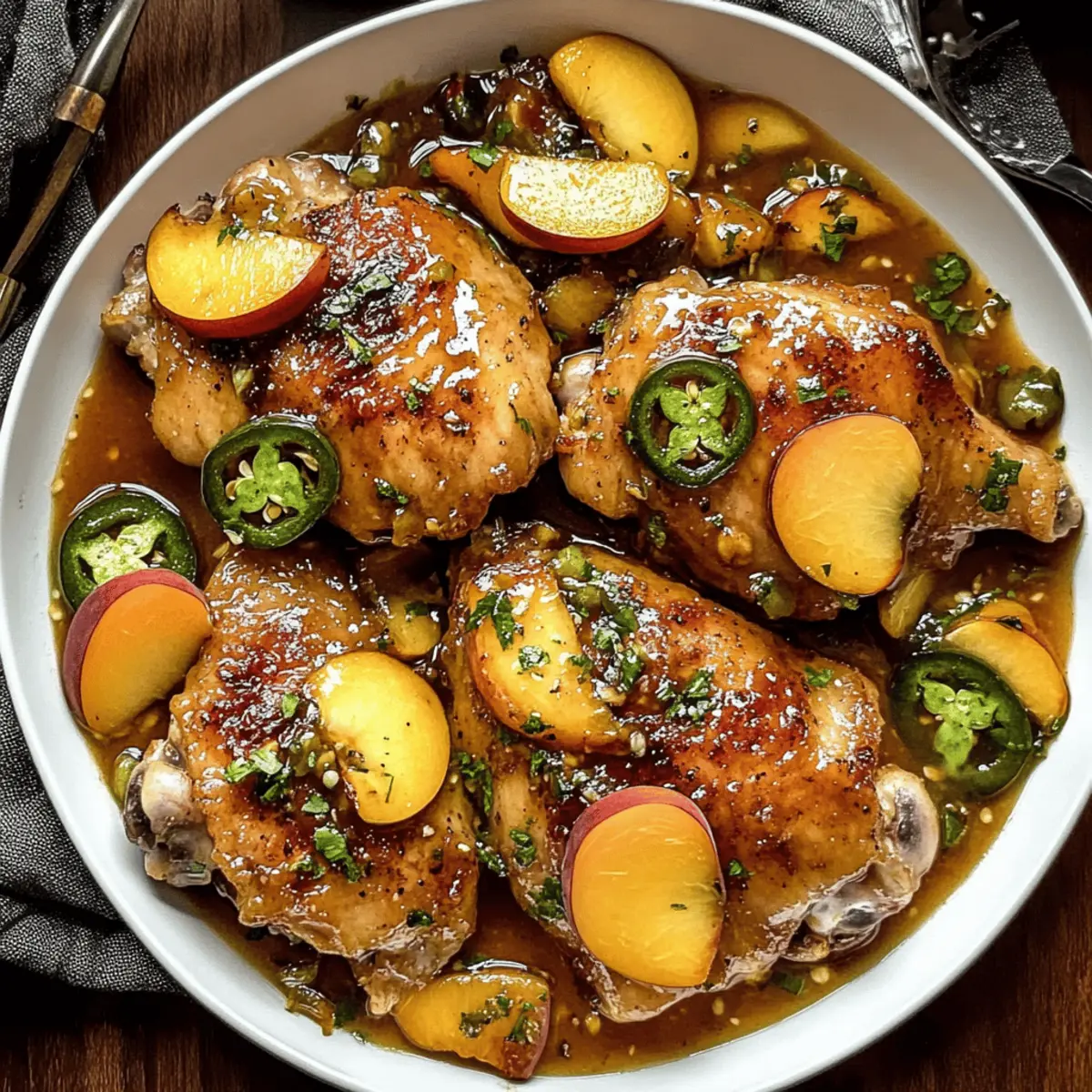- Pour the prepared peach glaze into the skillet with the sautéed jalapenos and peaches. Gently stir to coat the jalapenos and peaches with the glaze. Return the cooked chicken thighs to the skillet, spooning the glaze over the pieces. Heat everything together for an additional 1-2 minutes.