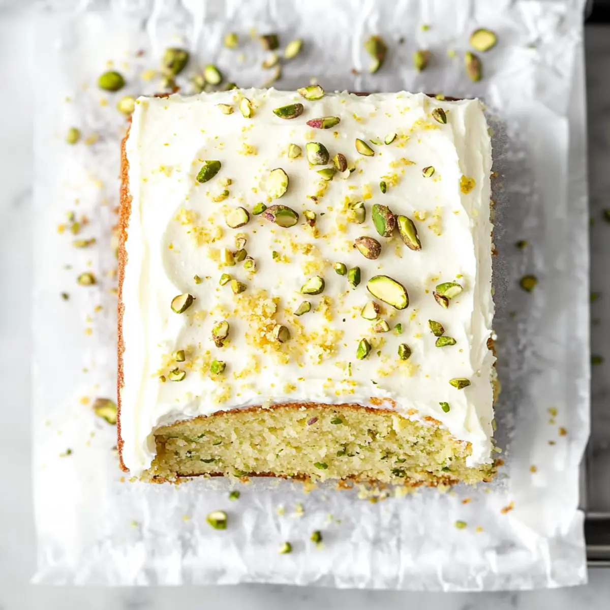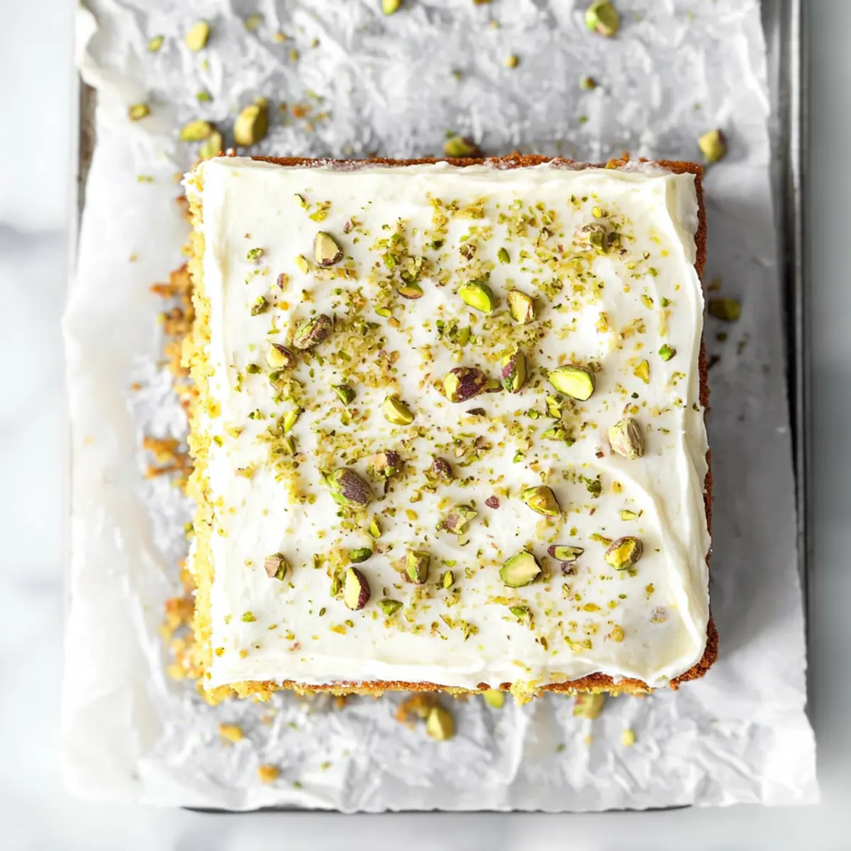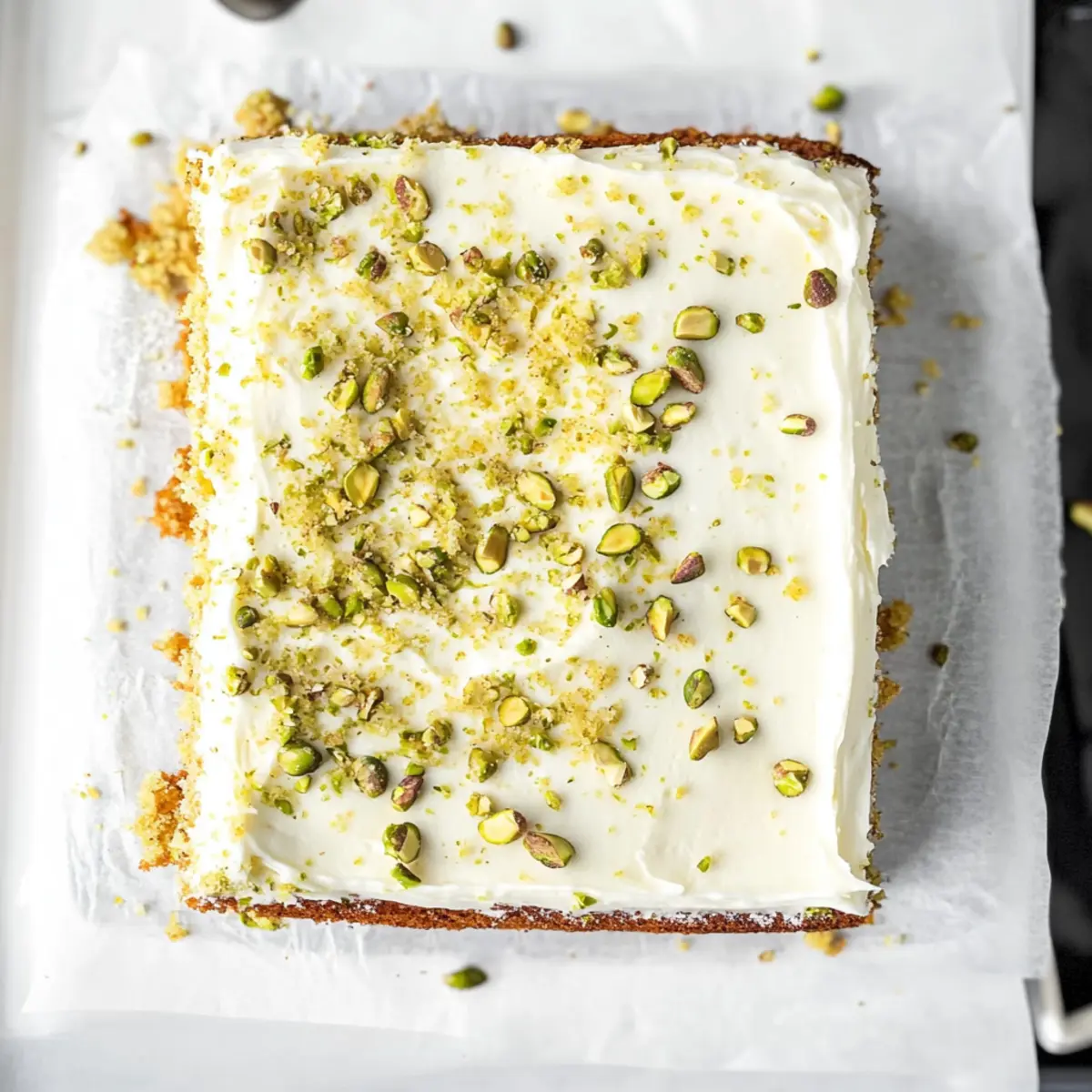 Once the lemon pistachio cake has cooled completely, spread the mascarpone frosting evenly over the top using a spatula. Be generous—this frosting is the pièce de résistance! Finish by sprinkling chopped pistachios for that perfect crunchy garnish, adding extra flavor and visual appeal.