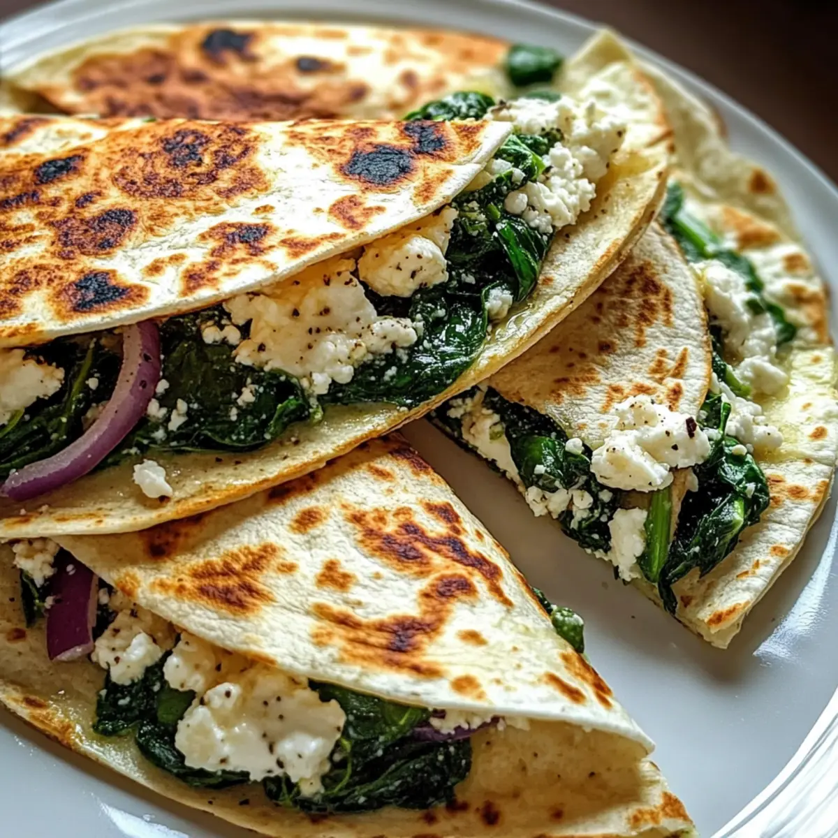 Mouthwatering Mediterranean Quesadillas with Spinach, Feta, Mozzarella, and Red Onion
