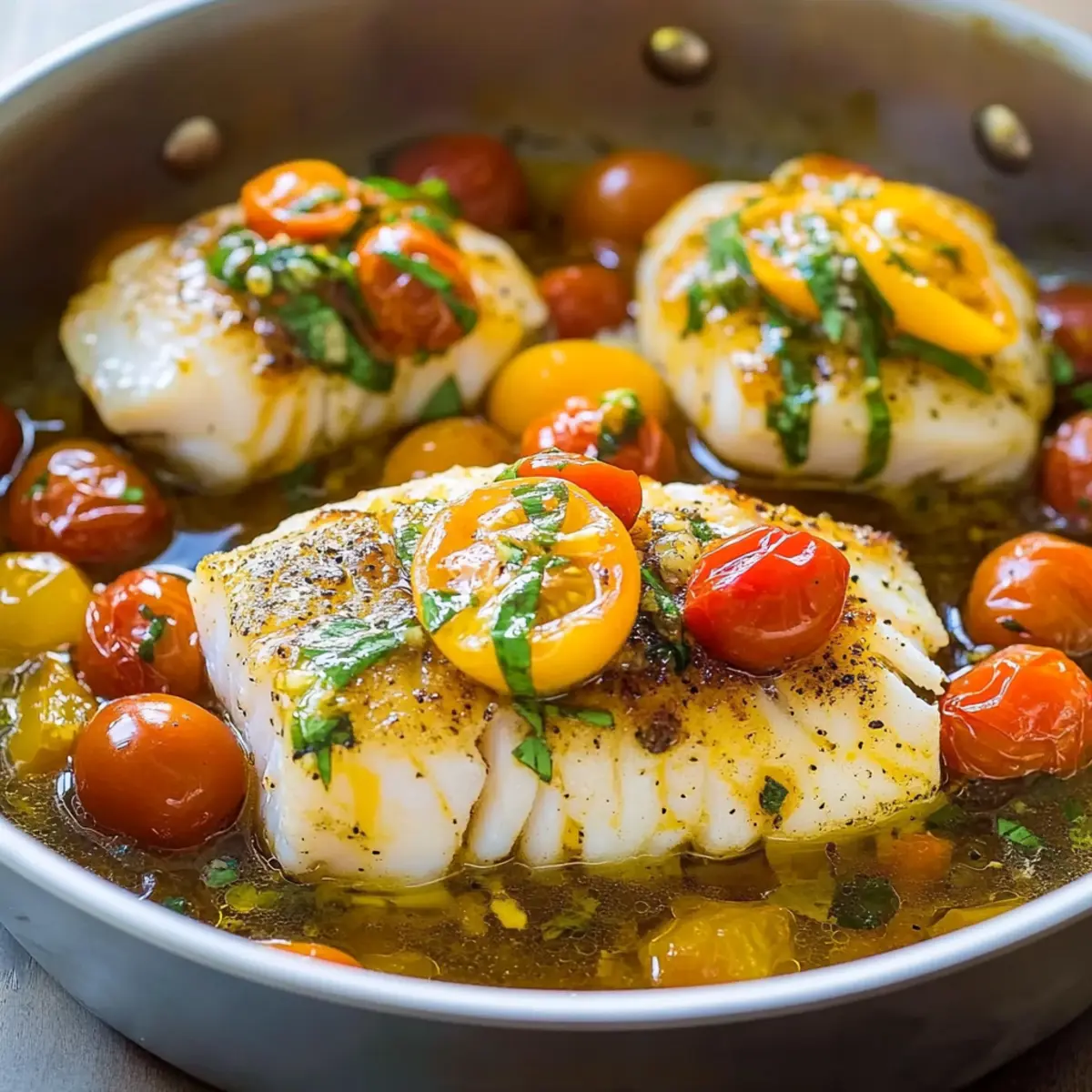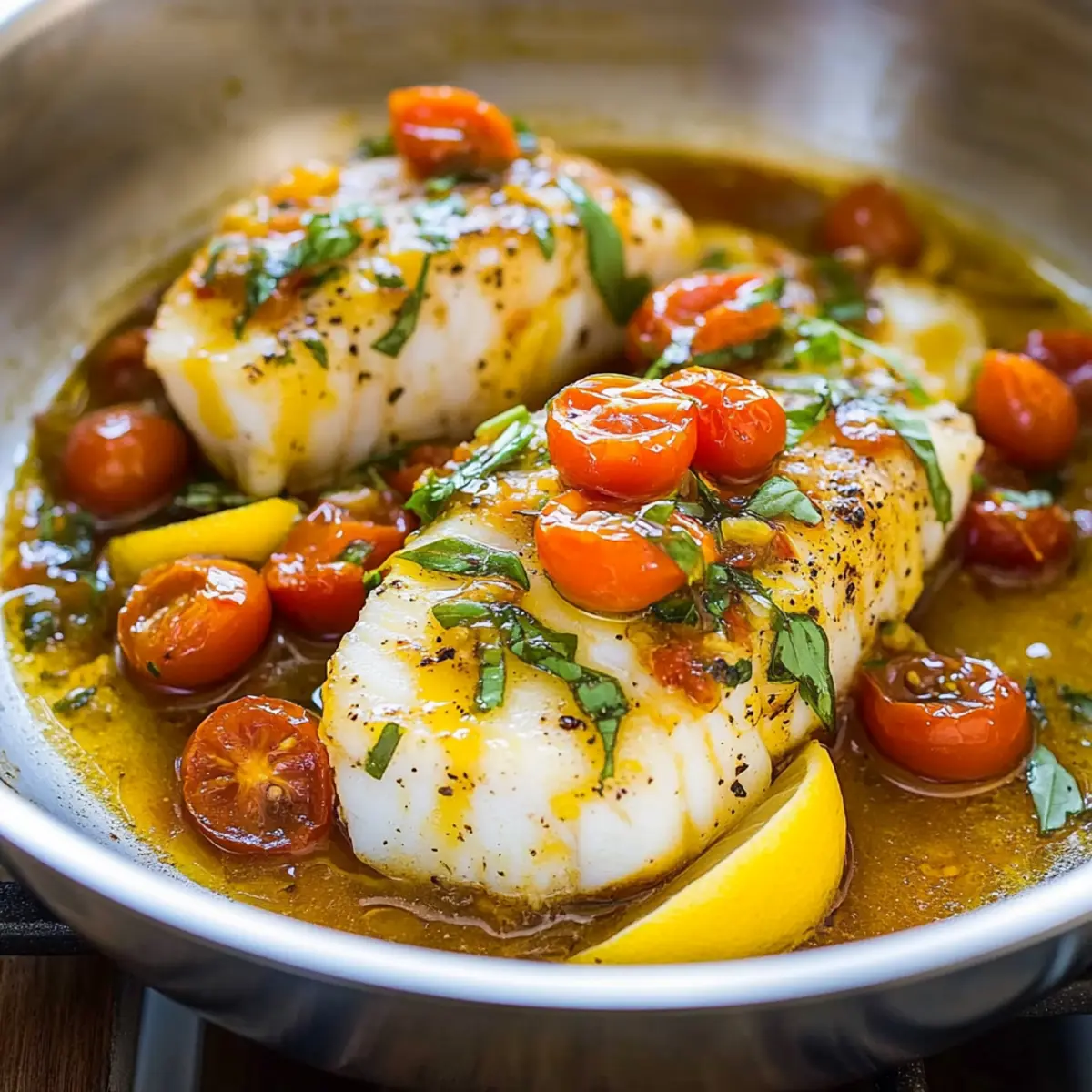 Savory Pan-Seared Cod in Zesty White Wine Tomato Sauce