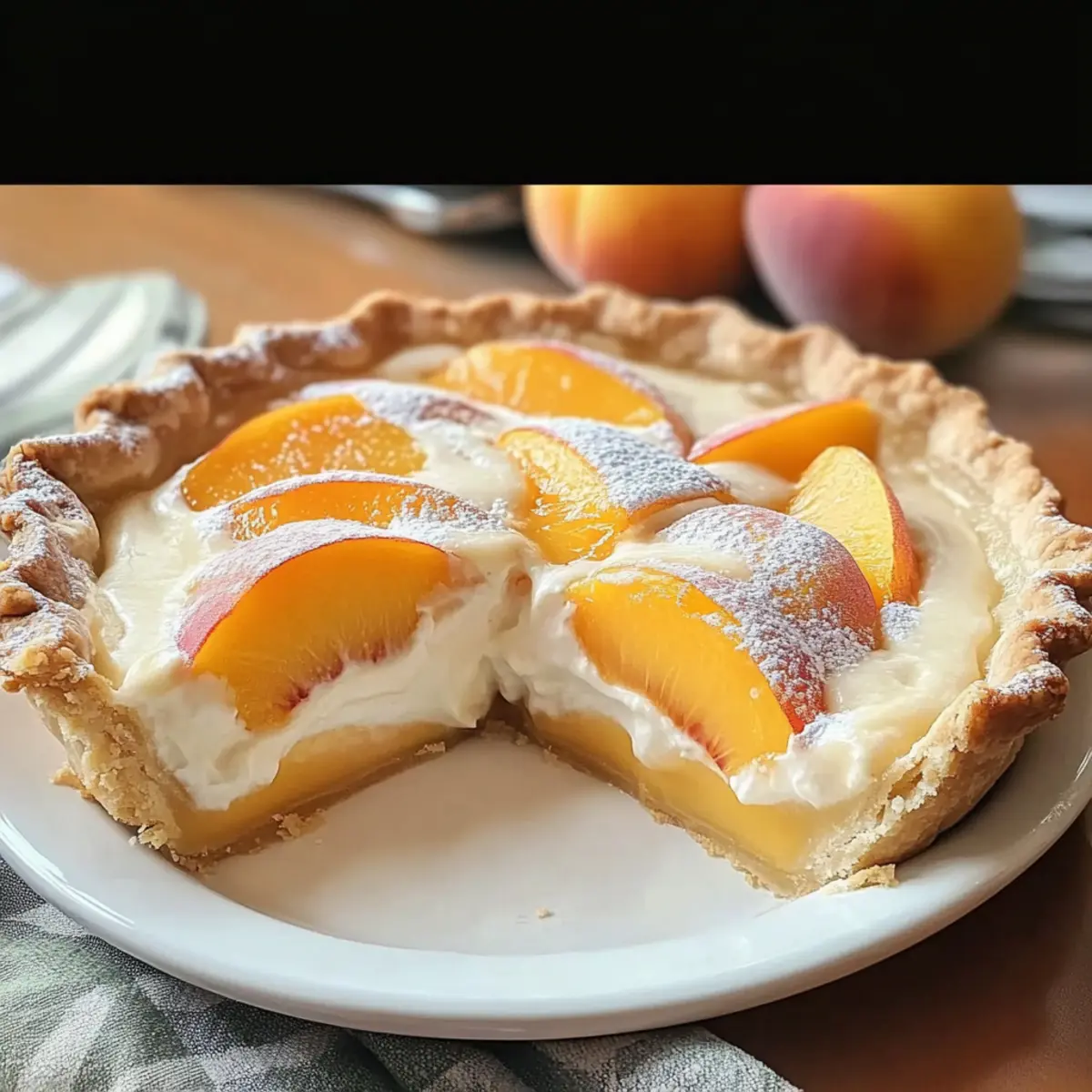 Sprinkle a light dusting of cinnamon sugar over the top of the peach slices. This simple mixture, made from granulated sugar and ground cinnamon, will add a delightful contrast of sweetness and spice to your Peaches and Cream Pie, enticing everyone with its aroma as it bakes.