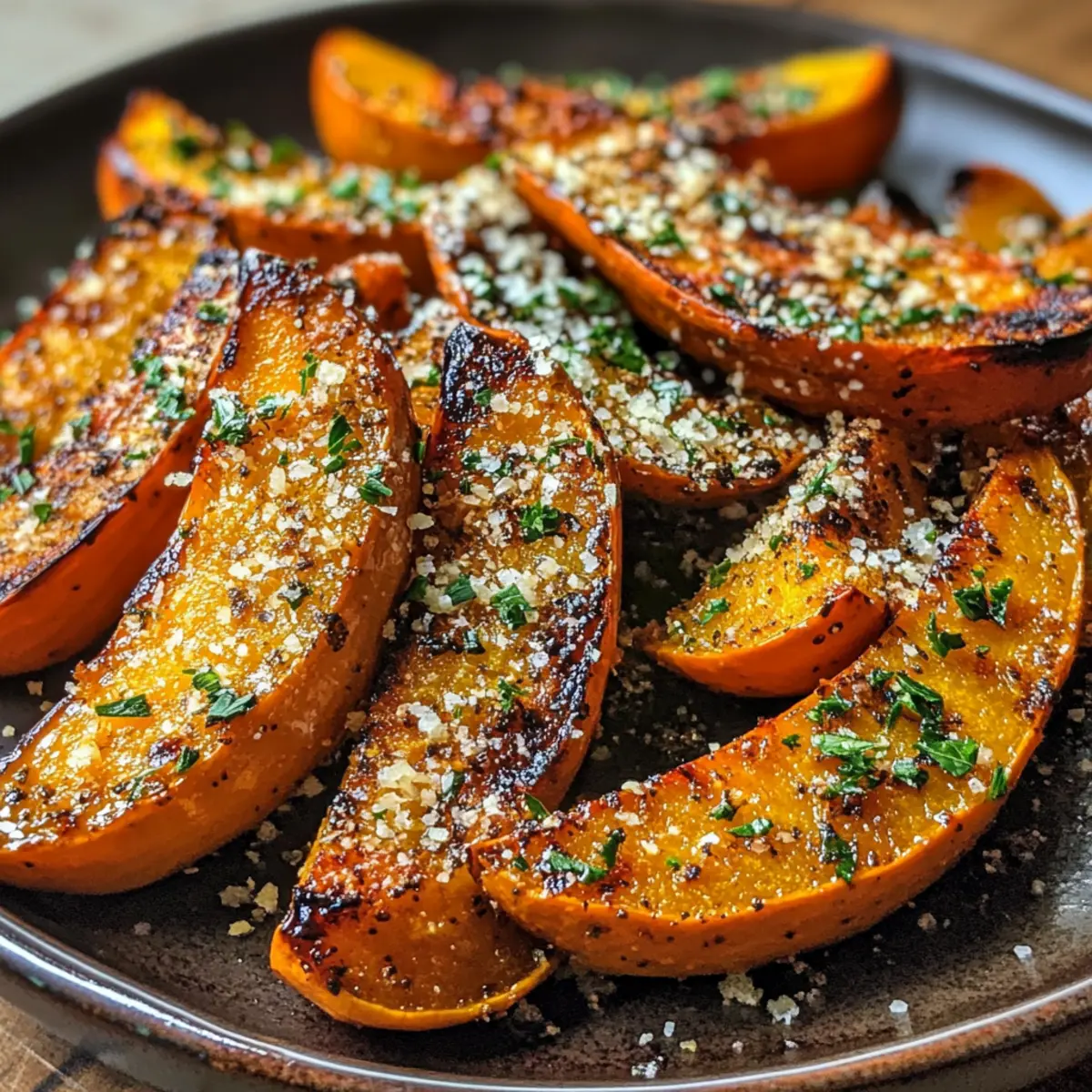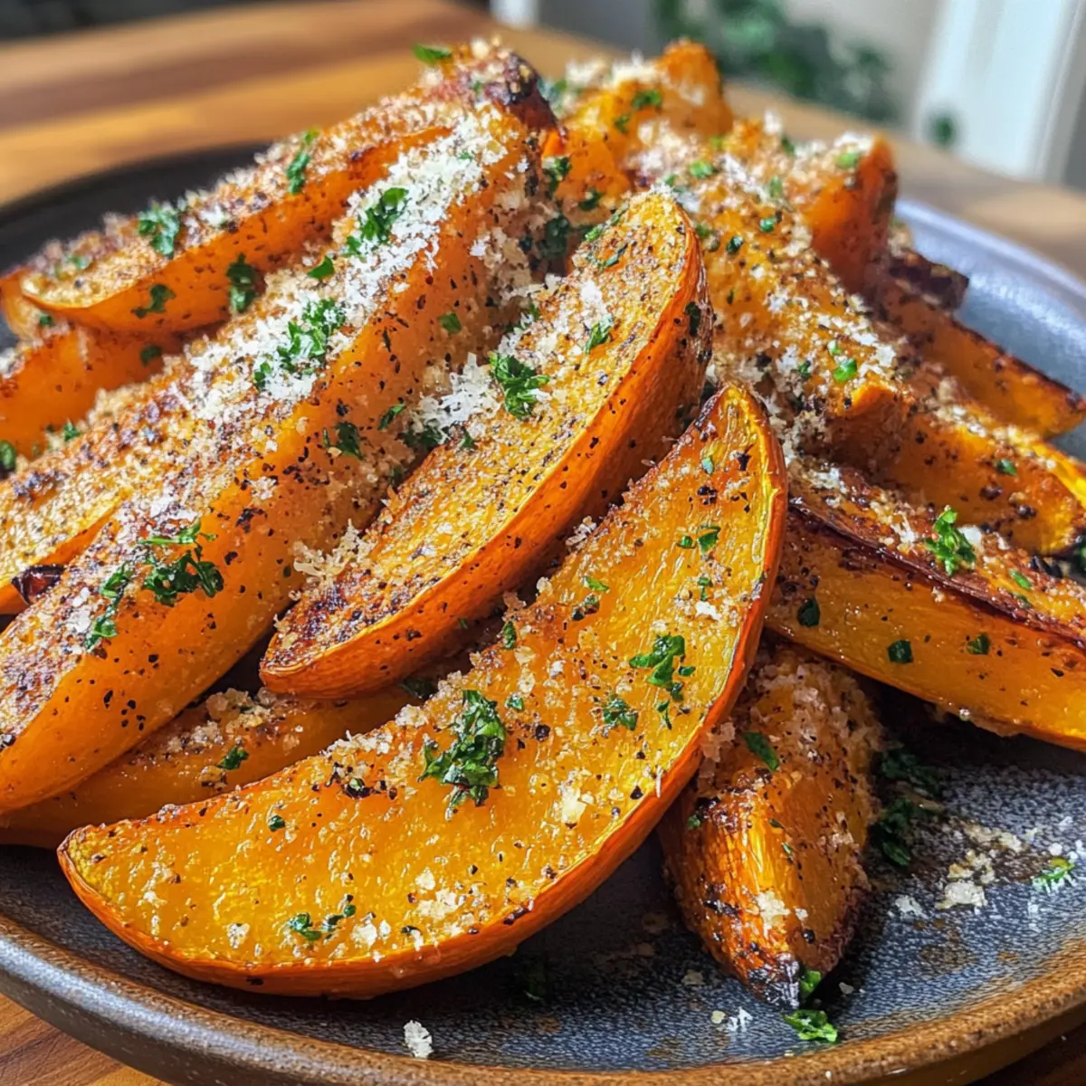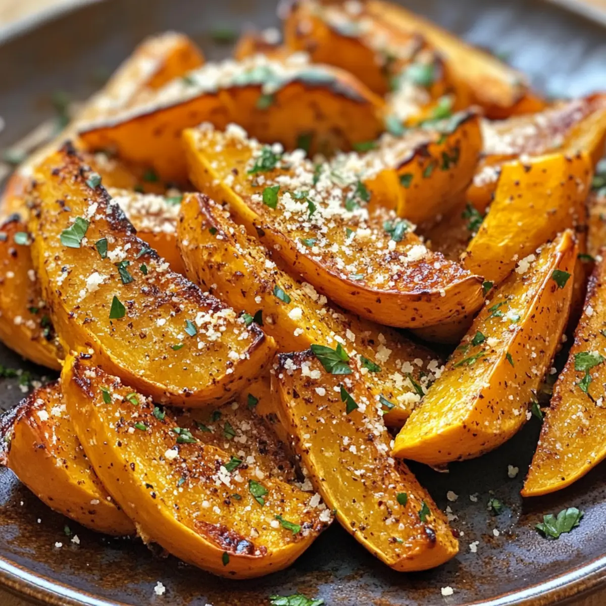 Once perfectly roasted, transfer the Roasted Winter Squash Wedges to a serving dish. For an extra touch of flavor, sprinkle finely grated Parmesan cheese and chopped fresh parsley over the top. Serving them warm will enhance the delightful flavors and aromas, making them an irresistible addition to any meal.
