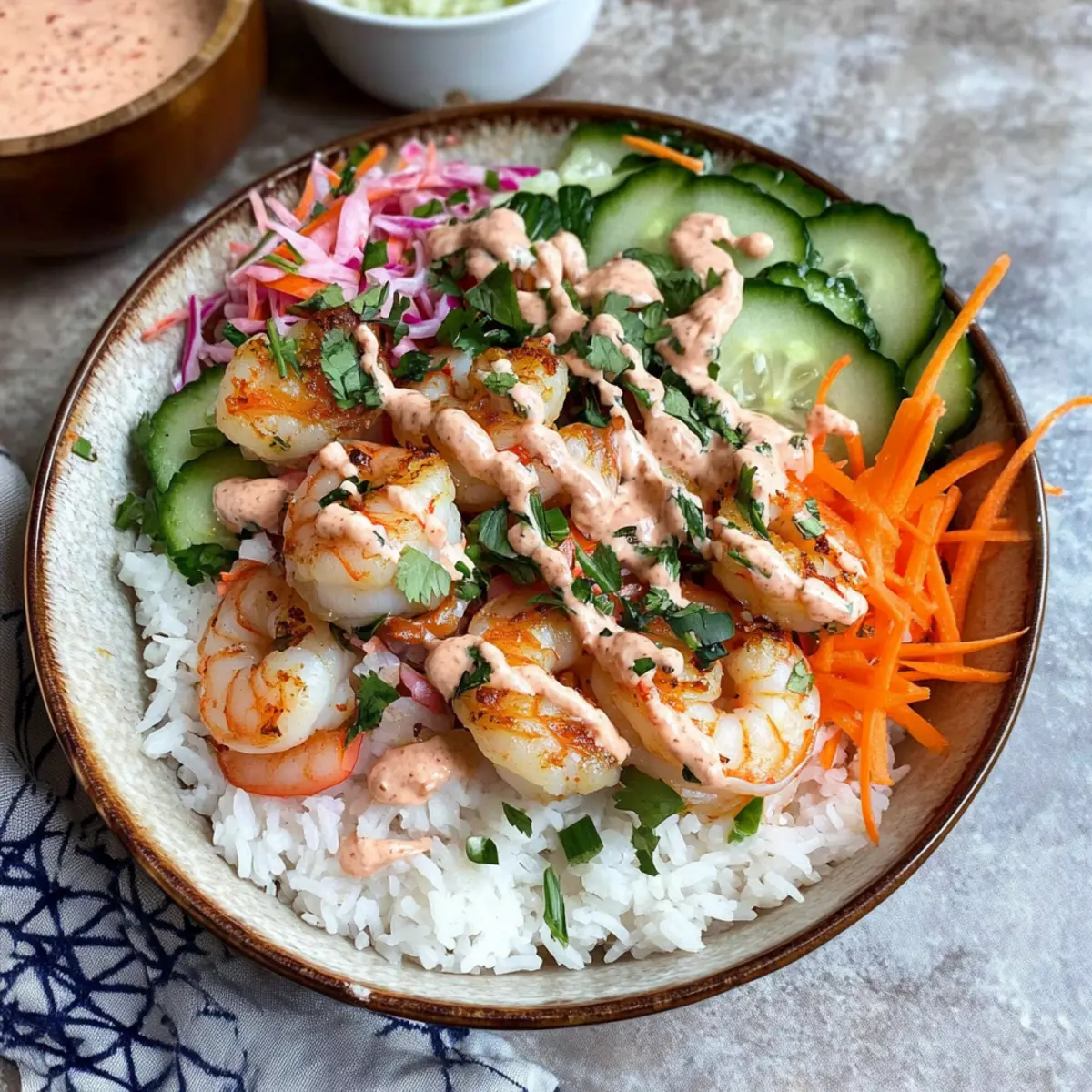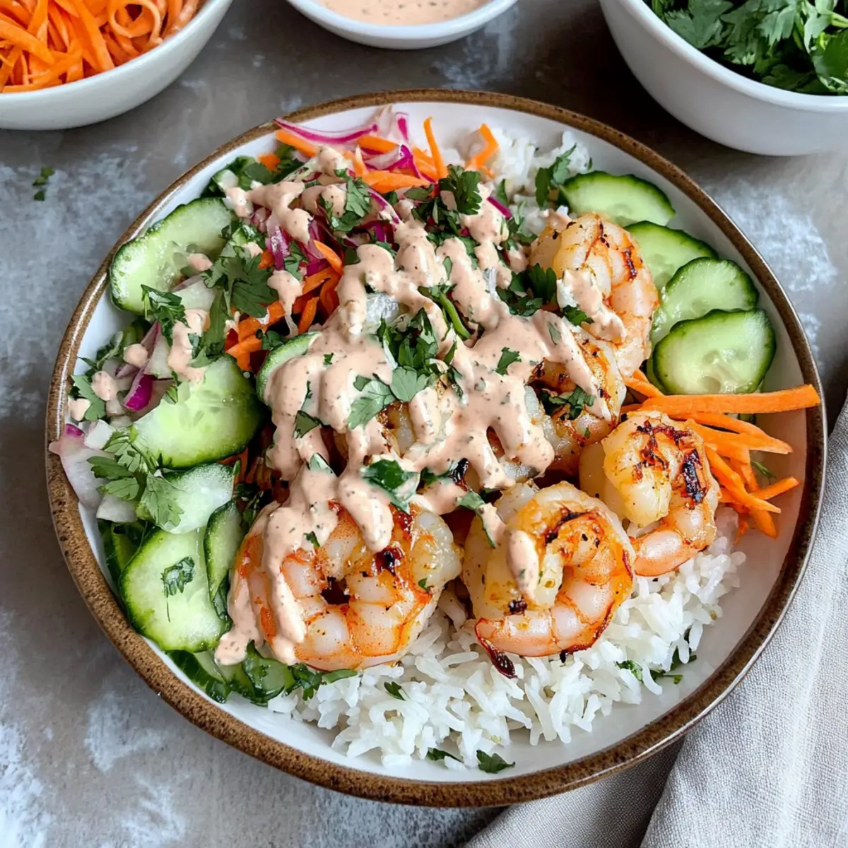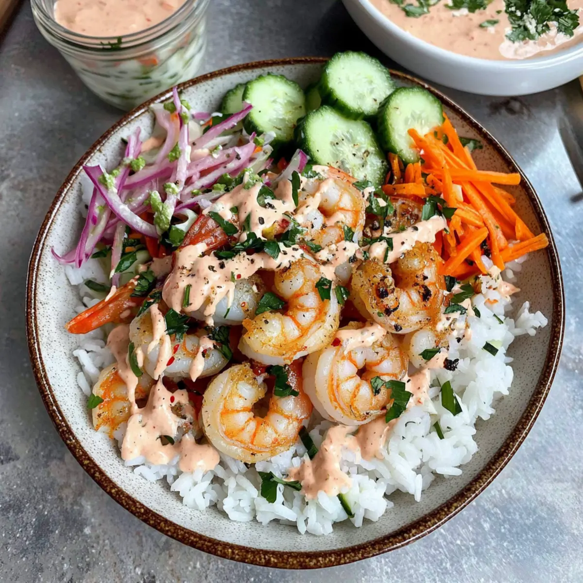 - Assemble the bowls by starting with a scoop of jasmine rice, followed by sautéed shrimp, shredded carrots, cucumber slices, pickled onions, and a drizzle of spicy mayo.