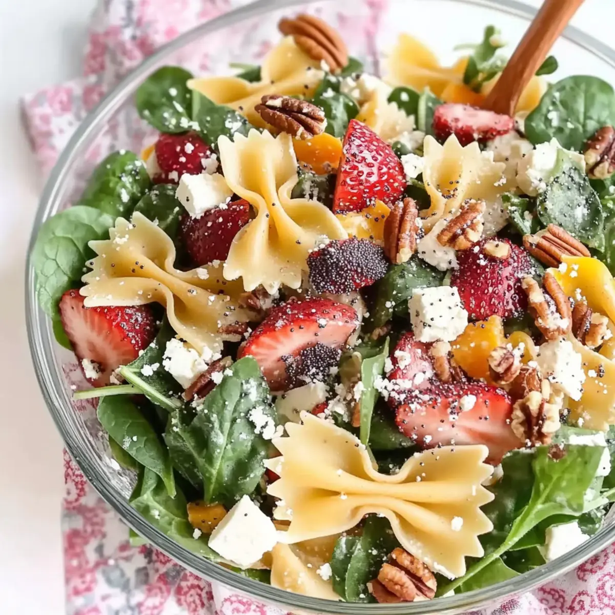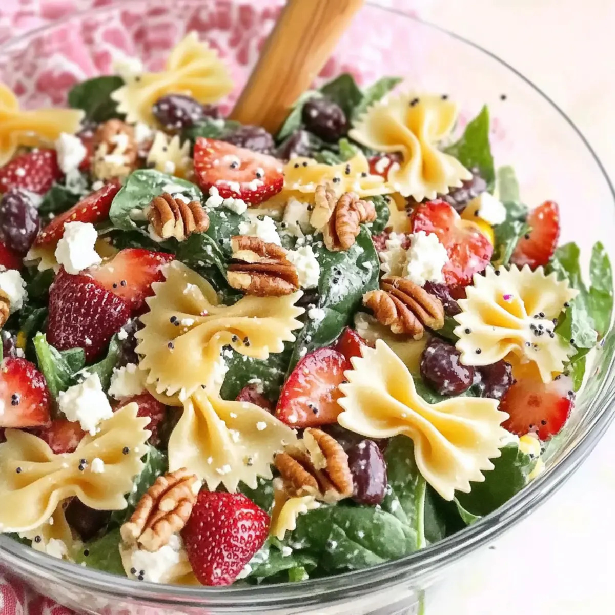 Now that your pasta is cooled and all salad ingredients are prepped, add the bow tie pasta to the large bowl. Toss in the strawberries, grapes, red onion, baby spinach, mandarin oranges, pecans, and feta cheese. Gently mix everything, ensuring an even distribution of each vibrant component, so that every bite of your Strawberry Fields Pasta Salad bursts with flavor.