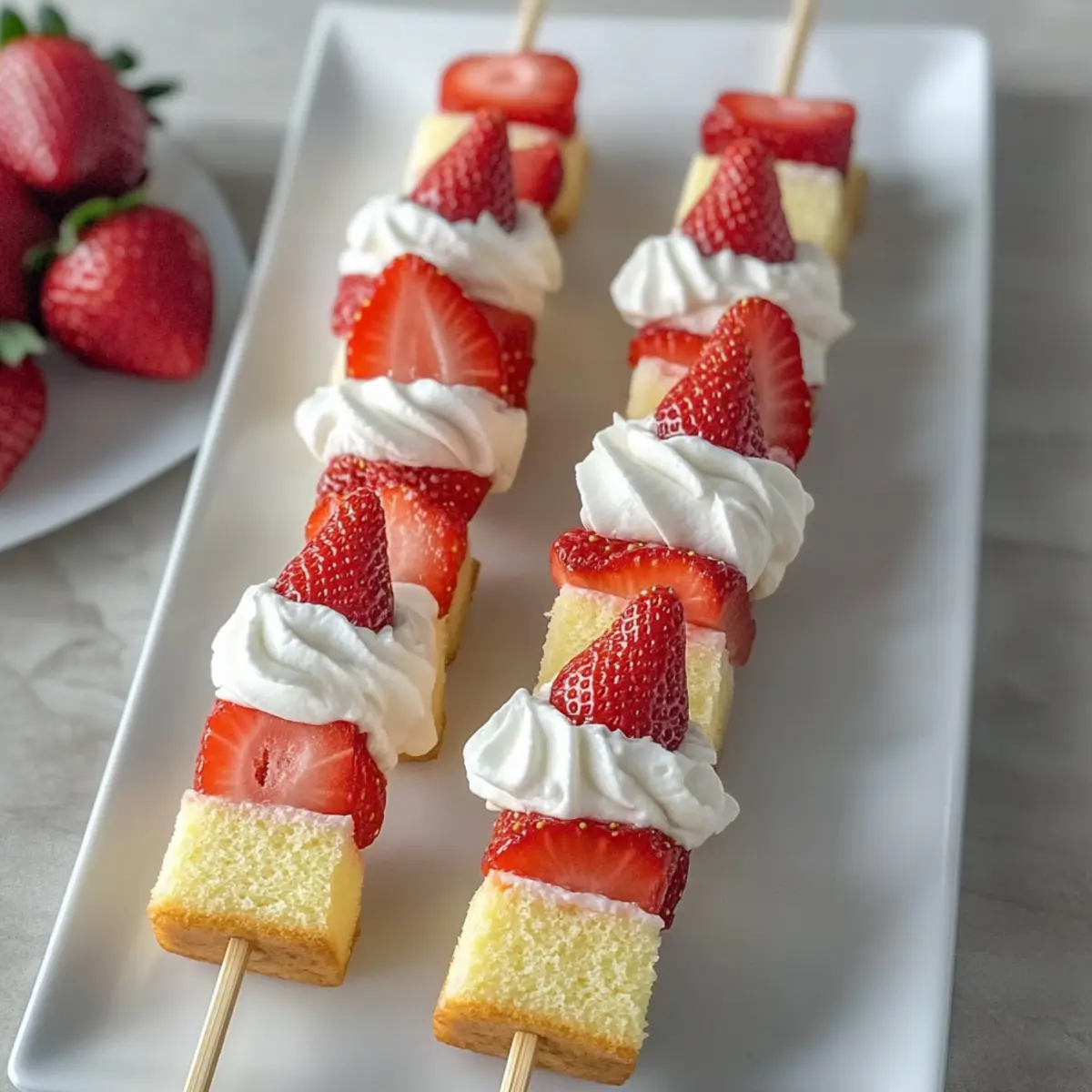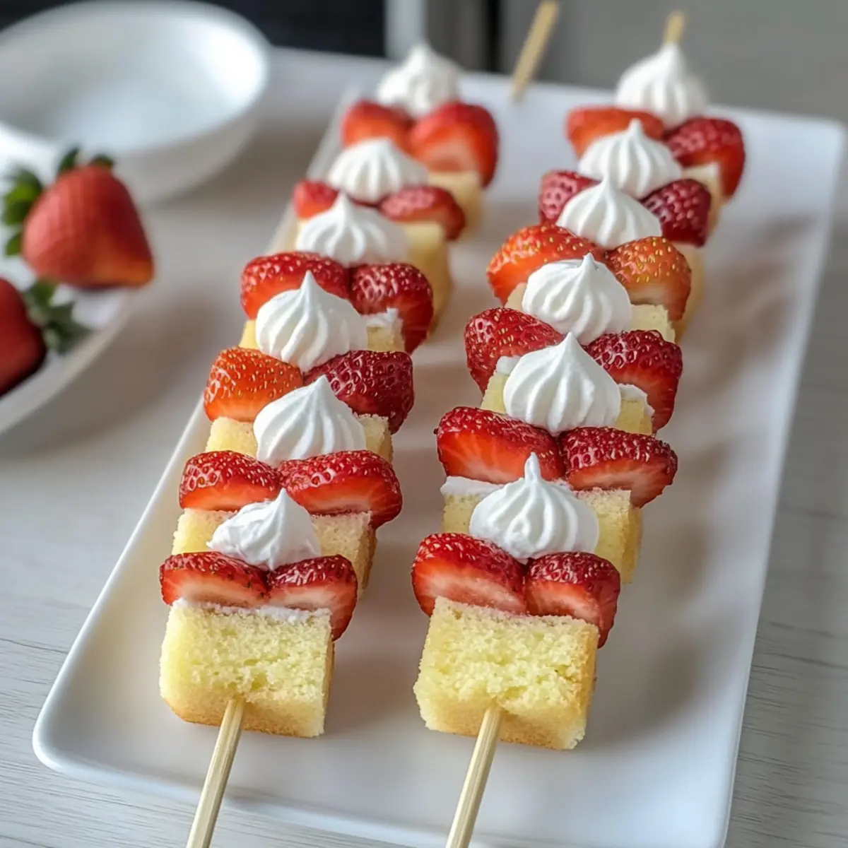 - Assemble Kabobs: Thread a strawberry and a cube of cake onto a skewer, alternating layers.