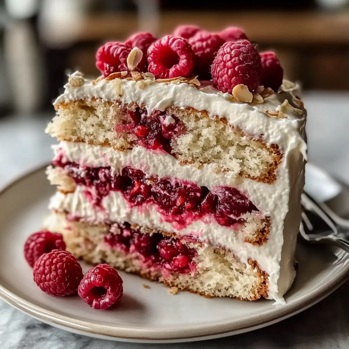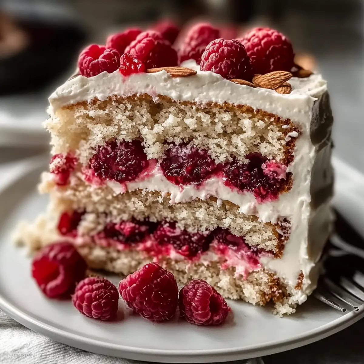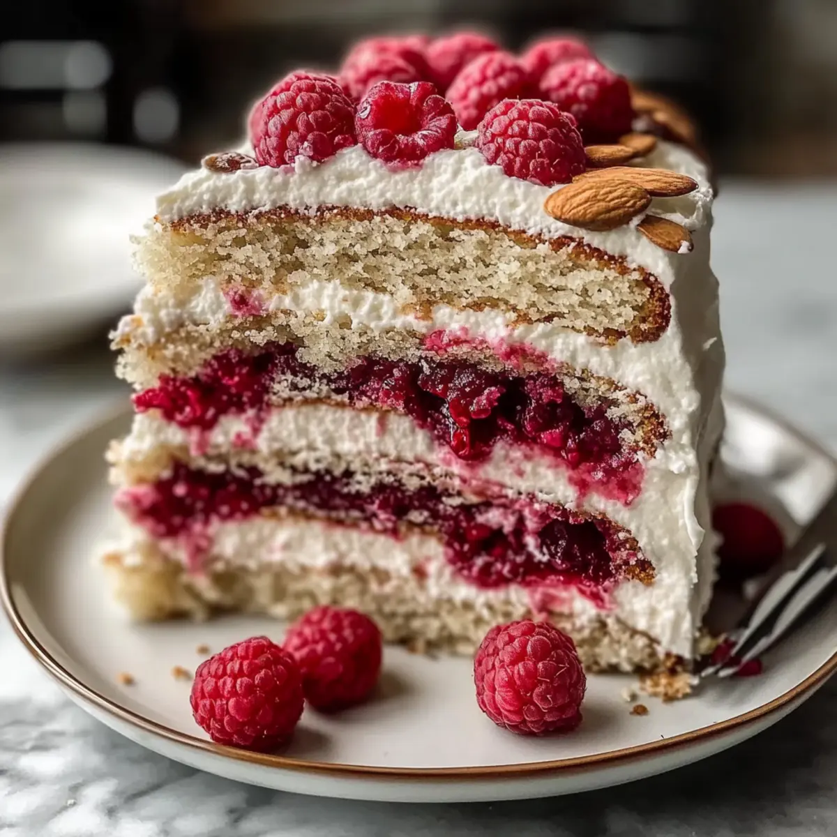 Serve the cake with a sprinkle of crushed almonds and a drizzle of raspberry coulis for a touch of elegance. Combining flavors and textures will leave your guests enchanted, ensuring smiles all around!